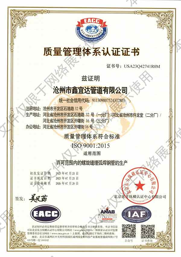 滄州市鑫宜達管道有限公司成立于2003年7月,坐落于滄州經(jīng)濟開發(fā)區(qū),占地面積40萬平方米,注冊資金1.81億元,是集螺旋鋼管生產(chǎn)、防腐加工以及無縫鋼管、卷板、帶鋼等品類鋼材經(jīng)營銷售于一體的工貿(mào)型企業(yè)。公司現(xiàn)有員工400多人,其中,中高級技術職稱的人員達120余名。 滄州市鑫宜達管道有限公司擁有9條螺旋鋼管生產(chǎn)線和3PE防腐生產(chǎn)線,可生產(chǎn)直徑219--3640mm,壁厚5.5--28mm,最高鋼級X100的各種規(guī)格防腐螺旋鋼管...